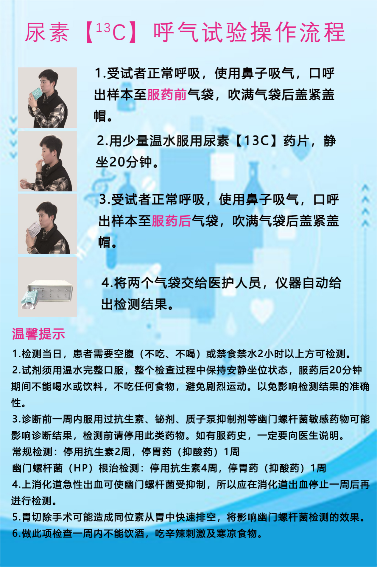 1.无创、无痛、无需插管、无需抽血,仅需口服少量检测试剂后吹气即可完成,过程轻松无不适。