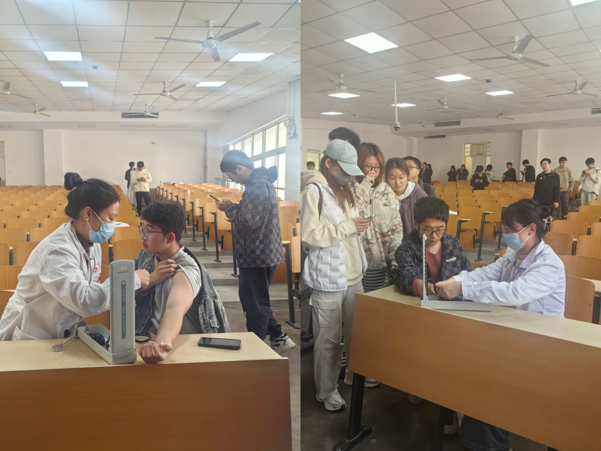 在互动环节中,张主任对师生提出的问题进行了详细的解答,讲座结束后,校医院的工作人员耐心的为师生们测量血压。